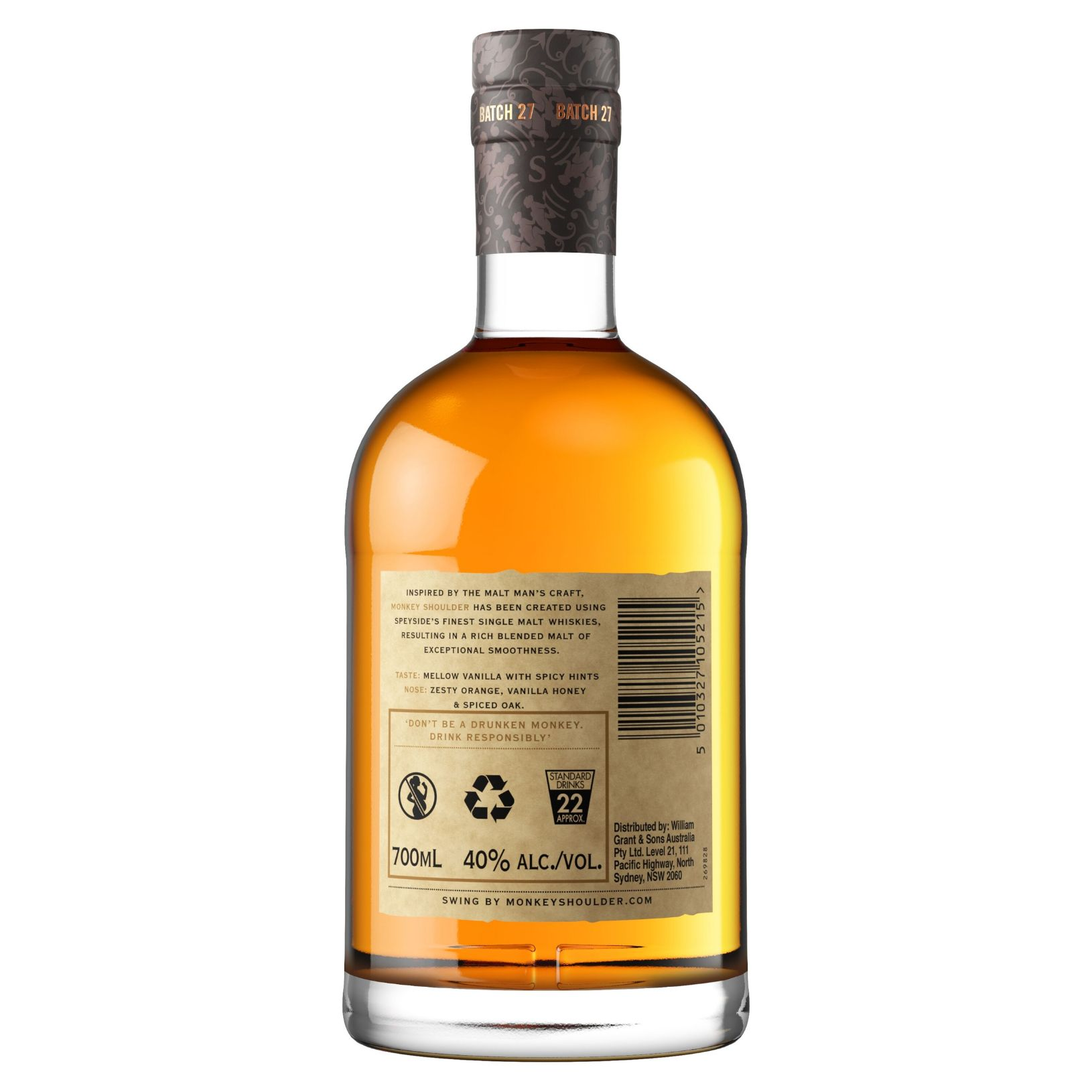 A smooth and rich triple malt Scotch, Monkey Shoulder is a premium whisky that is tended to by hand in Speyside, Scotland. Blended using only the finest malts, this delightful Scotch has aromas of cinnamon, sherry, butterscotch and berry while the taste is equally as enticing with flavours of tangy nuts, citrus, mint, oak and orange peel.